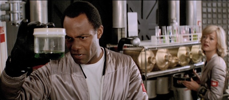 Some glowing green goo in the lab communicates with Sandy and she goes to the locker room to check herself out. There, Victoria Tennant is fresh from a shower. She goes on about how she can’t help to leave because everything here sucks. Sandy smashes the mirror and starts throwing glass at her. She then strangles and stabs her dead for talking shit about the planet. Holly comes in and sees what’s going on and Sandy screams for her to go away. Which, Holly does. She also locks her out of the operations room.