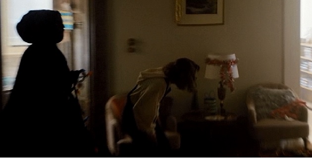 It’s starting to become obvious that Lindsey has not gotten home to her grandma’s yet. Also, the sorority’s cat has the black goo stuff from that ritual last night at DKO on her paws. While some of the girls are off to do their normal stuff for the day, Fran, who is soon to be heading home for the holidays, is left alone. She’s looking for the cat when she’s suddenly attacked Exorcist III style by one of the hooded guys.