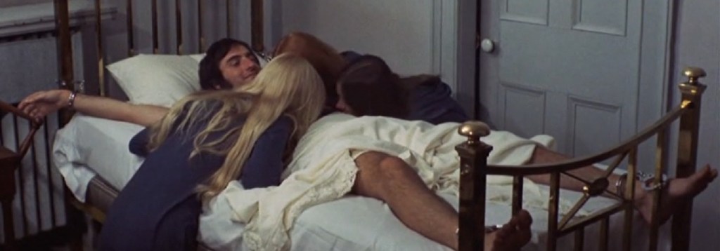 The next morning, Rick, the loan man brought to the house by the girls is still around while the other two have been killed and diced up. That night, we get to see a pretty decent close up of Anthea’s boobs as she screws Rick the Parade Man. He wakes up to find she has shackled him to the bed. This seems like a pretty cool thing, but, oh, it is not. Anthea comes in with a nice little smile, then her “sisters” come in behind her with a gravy boat.