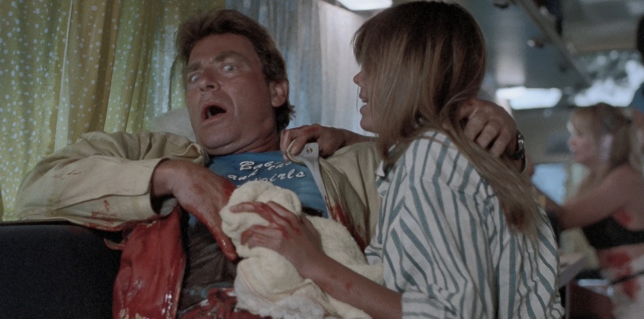 Now, if we’re also to keep score here, the guy who is top billed in this movie is now dead only thirty minutes into the movie. The guy who got the special “and” credit (Hagan) is very likely morbidly wounded. Also, one of the Ball Girls is also dead, victim of a hillbilly shotgun blast to the forehead through the windshield of the girls’ bus. That happens to be the 4th highest cause of death in Toxic Masculinity, Alabama.