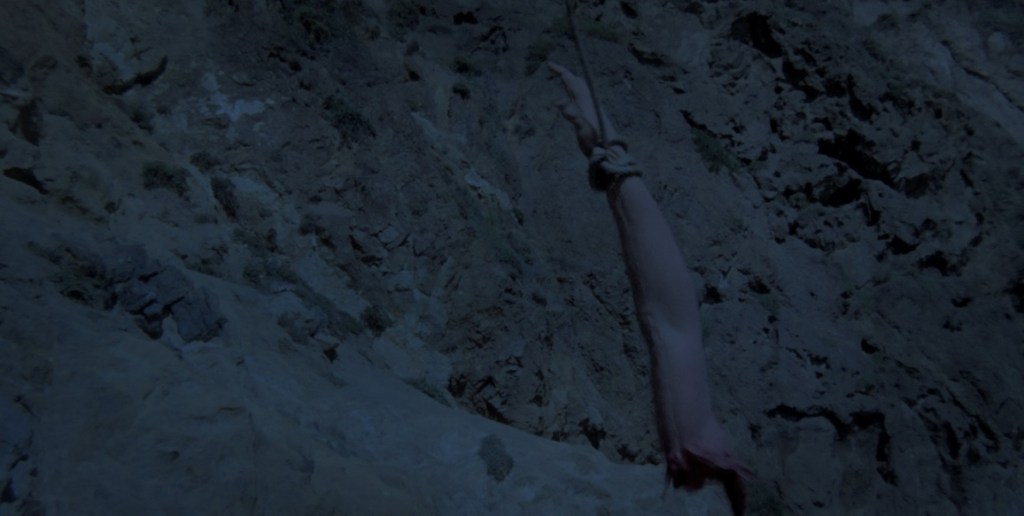 Well, Ted is also on the cliff sneaking up behind Mark. This is awesome. He kills Mark and stands him up and calls down to Jeff. He then pushes Mark off the cliff, and you see a rope tied to Mark’s right wrist. As the rope snaps tight, Mark’s arm is ripped off and his lifeless body falls to the ground in front of Teddy and Jeff.