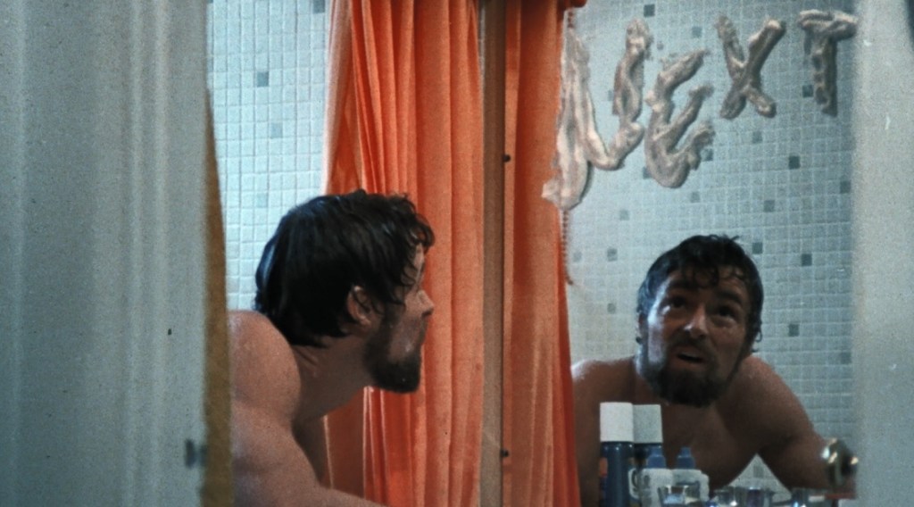Later, Jeff takes a shower, and he’s attacked and knocked out in the shower. When he comes to, a message is waiting for him on the mirror in shaving cream: NEXT.