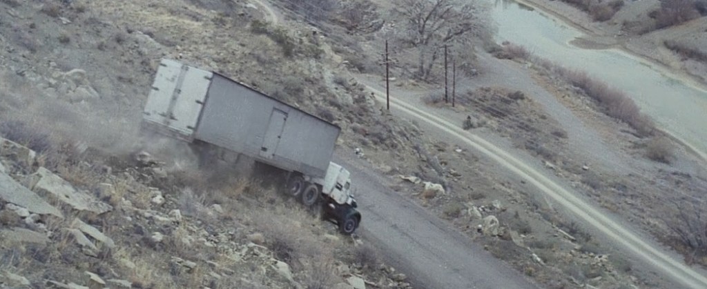 The movie decides to take a moment to have a scene that is best described as a music video while a song plays about truck drivers. There’s a combination of just b-roll footage of trucks on the highway mixed with still shots of truck drivers. Then a girl is hitchhiking and can’t get anyone to stop for her until she starts taking off her clothes.