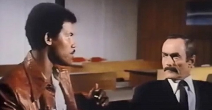 Leader of the gung gang is pissed at the guy who gave away the info on the gang members’ whereabouts. So boss man kills the dude by first smashing his skull against a wall, and then shooting him. Believing he’s put in a good day’s work, boss man goes home. There, he finds Mark Collins waiting for him and making himself at home with boss man’s magazines.
