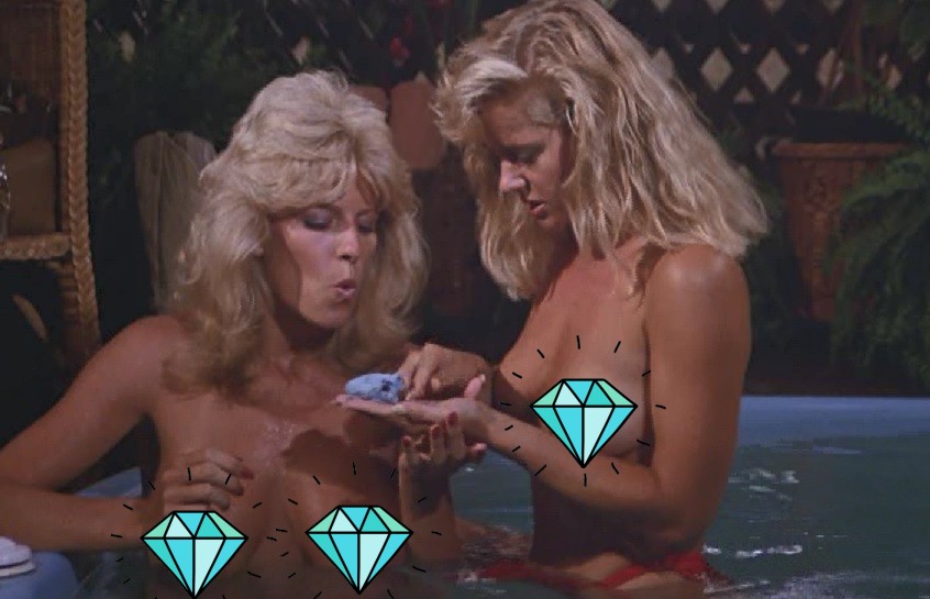 But fuck all that, Donna and Taryn are doing thinkin’ time in the jacuzzi! They open up the one package they recovered from the chopper and brought back with them (it was shown the second box in the chopper was dropped in the brush during the action sequence). When they open the package, they discover a tiny bag full of diamonds.