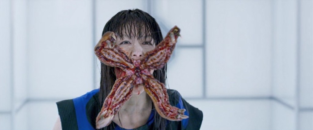Speaking of, just when the good guys are about to escape, the licker comes back and nabs Becky and kills good Rain. It also harms one of the Wesker dudes. Alice goes to find Becky and, I suppose, fight the licker by herself, while Jill and her team of evil clones show up to fight the good guys. The injured good guy kind of sacrifices himself so the other good guys can escape. Alice finds where the licker has taken Becky, which is basically to put her into a weird membrane-y sac on the wall. So she uses her little grappling hook thing to fly up and flip over the monster, shoot it many times in the brain, and then does a bad ass action pose.