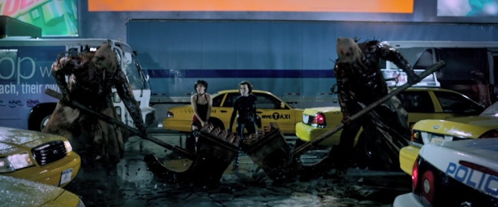 The Red Queen knows everything that Ada and Alice are going to do because she can see them. So in New York, she sends a couple of those hammer axe bros after the ladies. These are the nigh invincible types of monsters that suddenly showed up in Los Angeles last movie. These guys are really cool looking because they are giants who carry monster weapons. Those are awesome, but what I really like about them are the nails that stick out of their heads. It’s a cool design. It’s a design that works very well in their design for their video game versions, but, in a movie, it’s kind of weird for them to just show up like the one did in the last movie. In this movie? Sure. However, last movie, it was total fan service. It isn’t terrible to do that, but context and any kind of back story helps.