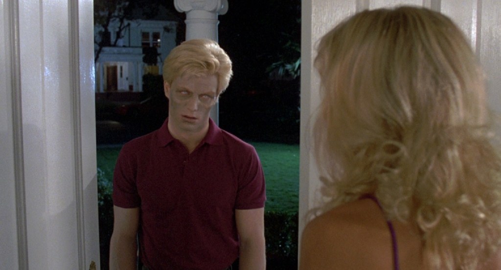Problem over, right? Well, not exactly. There are two endings to this movie. The theatrical which has Chris and Cindy celebrate their victory by making out. She sees the house mother’s dog come up and when she bends over to pick the dog up, it shoots a slug out at her. The other ending has the cops and the firetrucks and all that rush toward the sorority house with a crispy, zombified Cameron shuffling the other direction down the street. He falls over, the slugs come rushing out of his body toward a cemetery. However, searchlights come down from the sky indicating that the aliens from the beginning have come to clean up the mess.