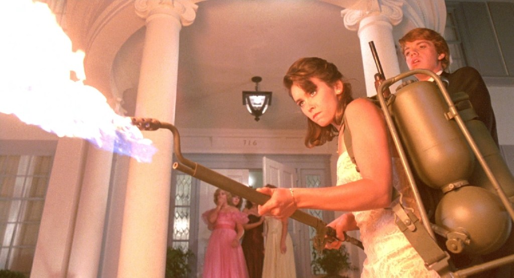 Why do all of these things just so happen to converge at this small college town? I’ll tell you why… It doesn’t fuckin’ matter, that’s why. As I said, this movie is so easy breezy that it doesn’t take anything seriously. Sure, the coincidences are a little silly, but you know what? It’s a silly movie. It combines so many wonderful little elements from the various genres it is tipping its cap to. You have the weepy 50s music as if to be looking fondly back on that more innocent time when people are still just playing grab ass and pledging frats and sororities and such. You have that part in black and white. You have a cool alien ship and adorable little alien dudes that have something terrible on board the ship. You have frat pranks, parties at school, and an upcoming prom. Later on, you get zombies who have funny scenes and people not really even paying attention to them the way you’d expect. All of these things can be incredibly charming on their own in movies. In this movie, each thing is charming as hell as an individual thing or all combined together. Mix in the incredibly likable Chris, Cynthia, and J.C. (and the bad assery of Tom Atkins) and you’ve got a real winner here.