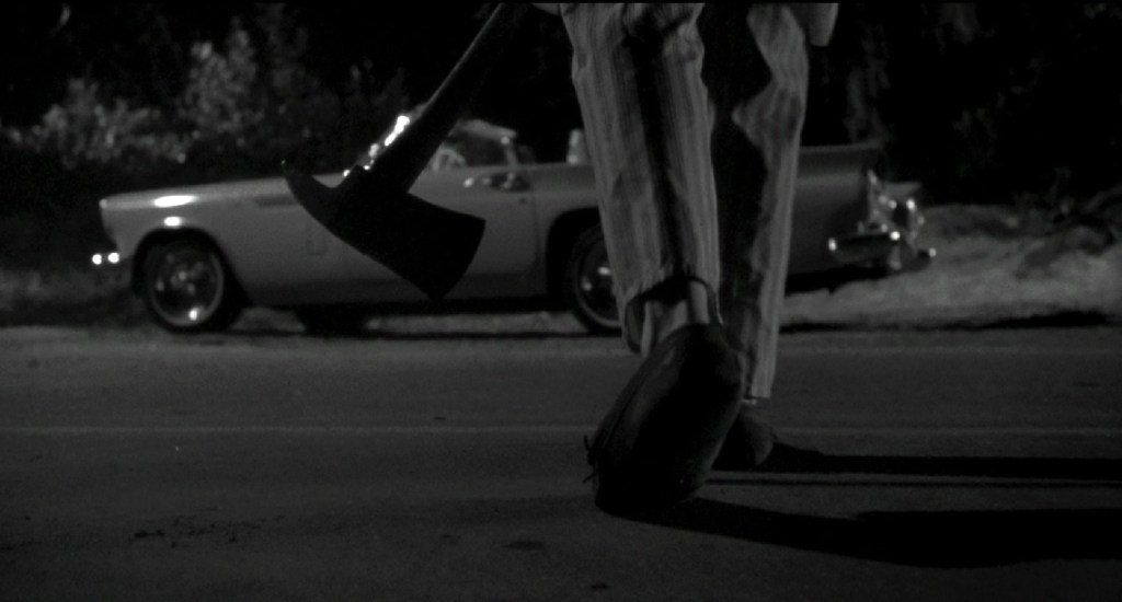 On top of all this, Hottie McBlondie here has just started dating this Chad McCoolsby and the beat cop who happens to come by to tell the kids to heed the radio warning about the mental patient and make like a tree is Ray. Ray was Hottie McBlondie’s old flame. The couple see a big ball of light in the sky and Chad McCoolsby here decides to go check out what possibly crashed in the woods. Meanwhile, the escaped dude is on his way down Route 66 toward Corman University wielding a large fire axe. Where are Chad and Hottie currently parked? Three miles outside the Corman campus on Route 66.