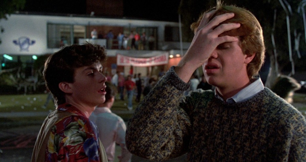 So, let’s talk a little bit about our lead actor in this movie, Jason Lively. Lively is the brother to Robyn Lively who appeared in Teen Witch, and Blake Lively who is enjoying quite a career for herself currently. While he didn’t exactly have the longest of careers as an actor, he did have a couple pretty solid credits. He was Rusty Griswold in European Vacation. He also got a leading role in one of Roland Emmerich’s earliest films, the horror comedy Ghost Chase. I am a bit curious why he didn’t stick with acting, choosing a relatively obscure life working for a computer company and the owner of a mobile roasted corn business, because he’s really likable in this movie as the nerdy underdog shooting for a really cute and popular girl to begin dating and take to the college dance.