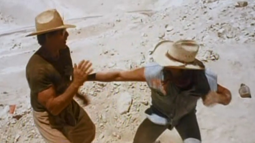 Okay, so there’s a dig happening out in the desert. It’s being overseen by two guys. First, there’s Joe Estevez. I’m not going to bother learning his name because I’m fairly sure he disappears quickly from the movie. Then, there’s Yuri, totally an American guy played by Jorge Rivero. The guys digging for bones or artifacts or diamonds (it’s probably diamonds) start to uncover something in the ground. It looks like bones? Yuri immediately starts kicking everybody’s asses. Why? Because Yuri is an ass. Natalie, our comely redheaded Eastern Ameri-European-can, comes up around the ridge to tell Yuri to cut that shit out.