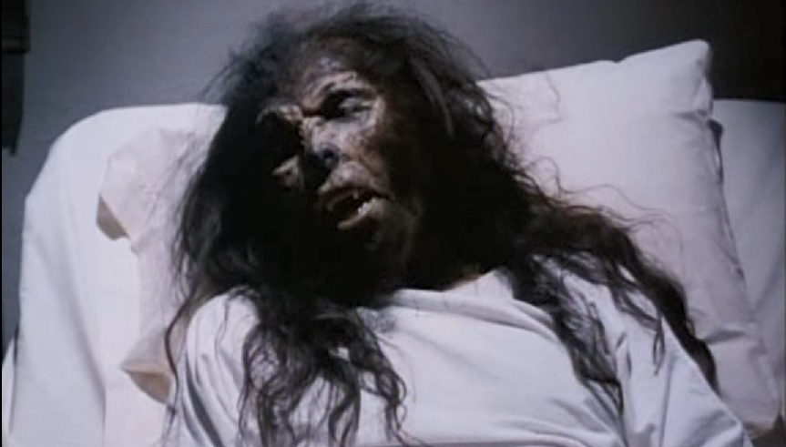 That night, a full moon comes out and Tommy transforms into a beastly dude. This is a fairly slow transformation I might add. I worry that the full moon will pass before Tommy goes full on beast mode. It takes about seven crossfades for him to go all hairy and toothy. He begins howling and snarling and leaves his room to go on a rampage. I might add that we see Tommy walking around the halls of the hospital from behind so we can see that under his hospital gown, he’s still wearing his Levi’s and tennies. That’s good they let him keep that on for his own comfort.
