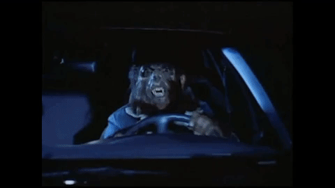 But we don’t care about that. We care about our werewolf security guard driving himself home. I do have to say… he’s a pretty good driver. He’s not run any children over. He’s not run into anythi… Uh oh… Oh no…