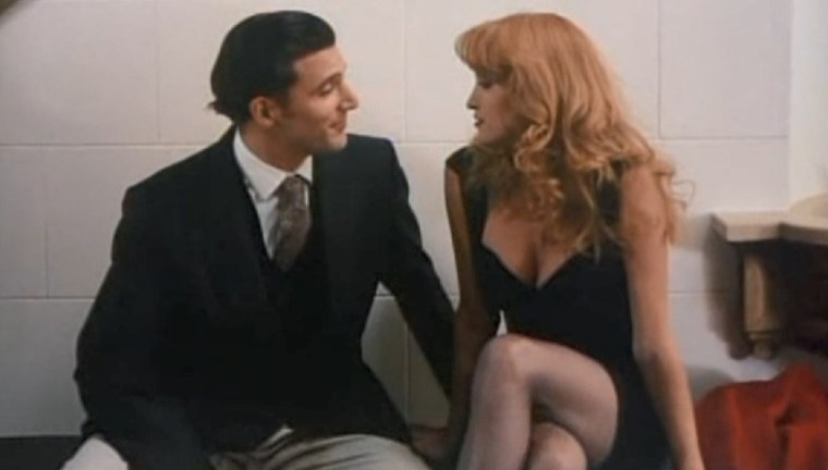 But our main stars are Tony Zarindast, Jorge Rivero, and Adrianna Miles. Zarindast is from Iran. Rivero was born in Mexico City. Miles, listed on IMDb as Adriana Stastny, is from… Europe? Somewhere? She’s apparently fluent in English (we’ll see about that in this movie), German, Italian, French, and Czech. I believe the last is indicative of where she’s from, but shit… All those other languages could be her first – except English. I will say this, Miles is a smoke show in this movie. I mean look at this…