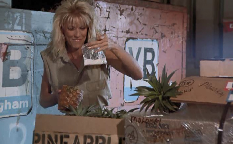 As they lead the dock workers away from their post, Donna and Taryn arrive with machine guns and sexy legs. They drop a satchel into what appears to be a van transporting pineapples and investigate. Donna checks out some boxes. Taryn scopes the place with a machine gun. What this is is a sting operation. Donna finds that some of the “pineapples” are just hollowed out containers to smuggle cocaine.