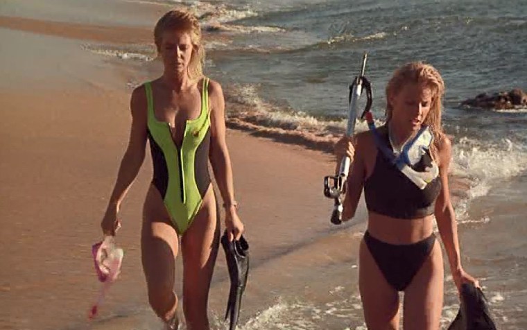 Okay, now that I got that out of the way, let’s get back to the movie. It’s funny that Taryn and Donna’s romp in the ocean pretty much comes at the point that ends the fun part of the movie and opens up the action stuff. It’s now become obvious that Donna and Taryn haven’t come back so they must be in trouble. While Shane is trying to get a search party to start looking for the shipwrecked pair, They have started taking care of themselves by picking coconuts and going fishing… With gear and swimsuits that I’m not sure they should have brought with… You know what? Fuck it. We’re several movies into this series. Who gives a shit?