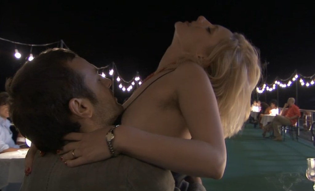 Marta and Dario return home and she is looking horny. She sexily hikes her foot up on the coffee table and Dario realizes Marta is sans-panties. Marta says that he was the one who dared her to not wear any. She also says that people noticed. He saw her dancing with creep-o. He says he’s a whore-monger. She says maybe she liked him. After all, she is a woman and she can find men attractive. As she continues to go on telling Dario that this man not only touched her ass, but he fingered her too. This begins to drive Dario mad… sexually. He starts kissing her passionately – including her neck.