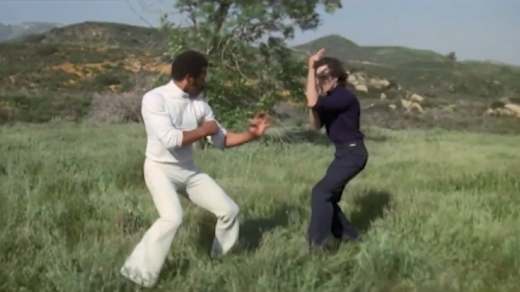 Johnny calls Nancy to have her meet him at his place. When he takes off for what’s likely to be sexy times, a car with a long-haired man follows. Johnny? He’s no fool, he makes a quick turn and momentarily shakes the shadow on him. A chase does ensue. Johnny takes off on foot forcing the man following him to come along. Then… KUNG FU!