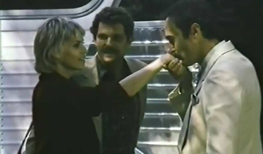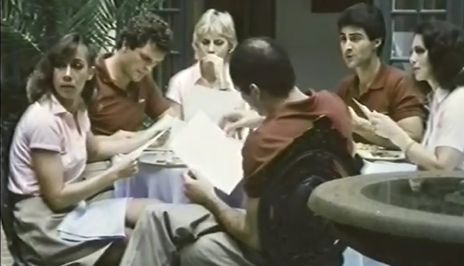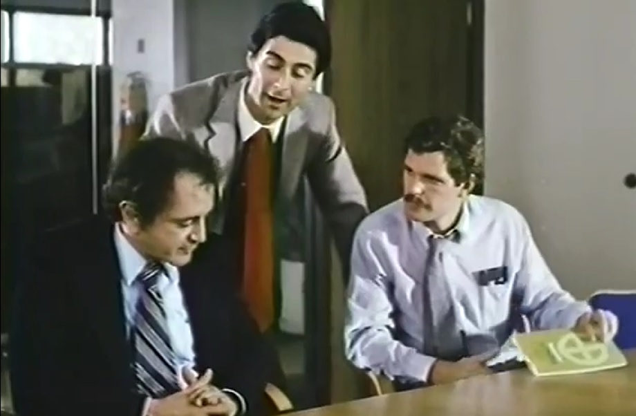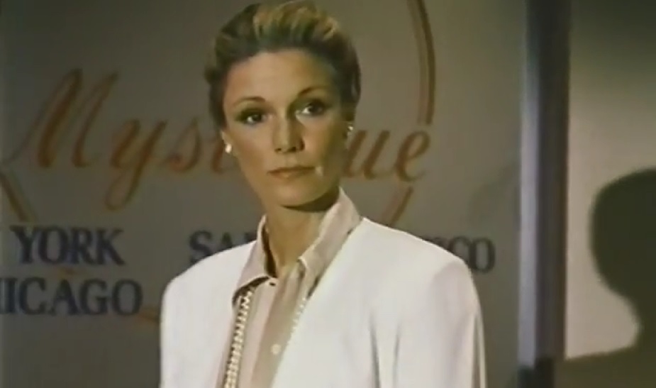 Cut to another meeting room in which some of the middle management folk are looking at a promo film for Mystique. This commercial has a pair of naked tits in it. Some people are titillated by the ad, and the guy who created the ad is very excited for what was created. Others seem to think the ad is a bit more sexually preoccupied than what should really speak for the company. The guy who created the ad, Chris, played by Leo Rossi, and another manager who thinks the commercial was pretty decent, Jack, played by Christopher Allport, are both planning for the weekend-long Executive Development Training for Mystique.