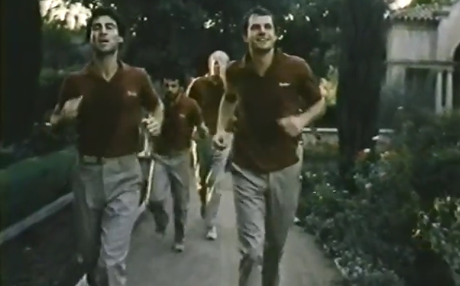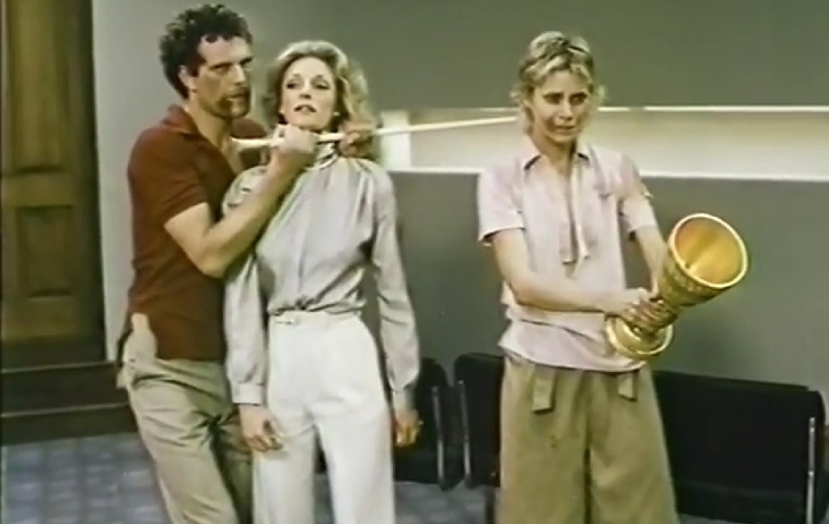 Outside of Mimieux’s towering presence, we have two other things to note, first, the similarly dressed trainees and what appears to be a some sort of wrestling match in a kennel. The kennel part leaves something for the imagination because, to be honest, I’ve been to some corporate training things but never have I had to strip down to my drawers and wrestle another man. The key thing is the similar attire of the attendees of this training seminar. That’s weird. I get the idea of going to a trade show or convention or something and be dresses similarly as part of corporate comradery, but training? That feels super culty.