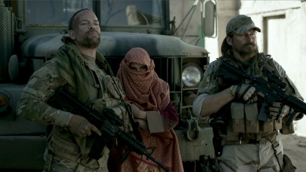 So… what are these guys doing here? What’s the mission? Fuck if I know! We’re just here to see guys with machine guns saying military shit and shooting Arabs. I’m guessing there’s bad shit happening, but all this is here for is to see this group of bad asses go around and do bad ass shit. They also get to show the thinnest and tiniest bit of personality as one of the guys kisses a rabbit’s foot for luck and the other guy belittles him a little bit when he offers him the foot to kiss too.