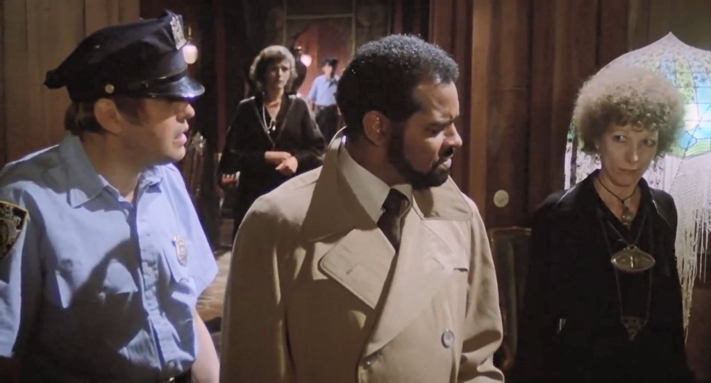 A cop shows up to investigate. I’m pretty sure the cop might be Jeffrey Wright. He looks a LOT like Jeffrey Wright. he doesn’t buy this shit that Mary died while performing a séance. He thinks some of the people here are tripping on dope. Maybe he thinks she was murdered by these drug-addled hippies. Then, Teresa basically calls this Jeffrey Wright-lookin’ dude a comic book character and I chuckled.