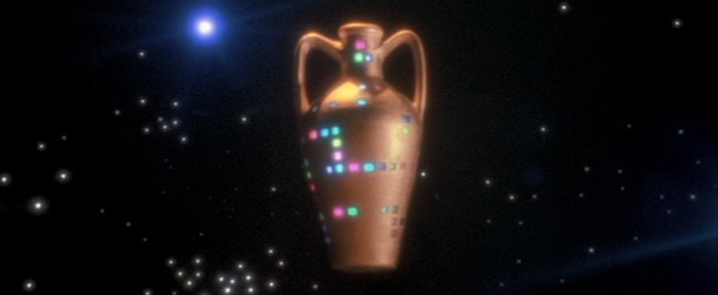 Okay… Again, I thought it was Pandora’s BOX. Not Jar. Have I been lied to all my life, or for this movie, or what? I wish I could say I cared quite enough to look it up. But look at that jar… It’s got little sci-fi lights and buttons and things I’m sure makes “boop” and “beep” sounds. Anyway, when Pandora’s Jar busted open, all the stuff that flew out of it made up the planets, stars, and galaxies.