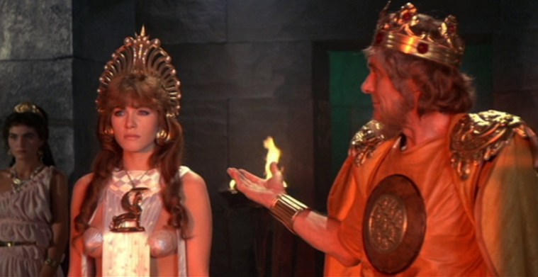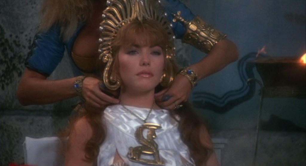 Yes, Cozzi wanted to have both fantasy and science fiction melded into one story, but it simply doesn’t work. Those two things are diametrically opposed to the other. Minos is the sci-fi guy and he engages in doublespeak about how he is devoted to Daedalus and what she can teach him about technology, Everyone else appears to be in a fantasy movie, but I can’t say that for sure. Sybil Danning is a bad guy but we’ve only seen her in, like, only 3 or 4 scenes so far. It’s not a great watch, guys.