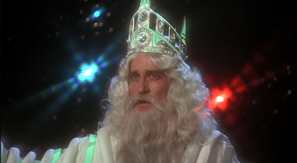 This is one of the cheapest and ugliest movies I’ve ever seen. They have this big, dramatic music that plays as it shows off the island of Thera. It’s just so clearly a miniature and it’s bathed in green light and always looks like night. What the flying fuck is this? When you fly through the stars, it’s bad looking. When you look at where Zeus, Hera, and Athena are making their plans, it’s just… It’s fucking awful, folks.