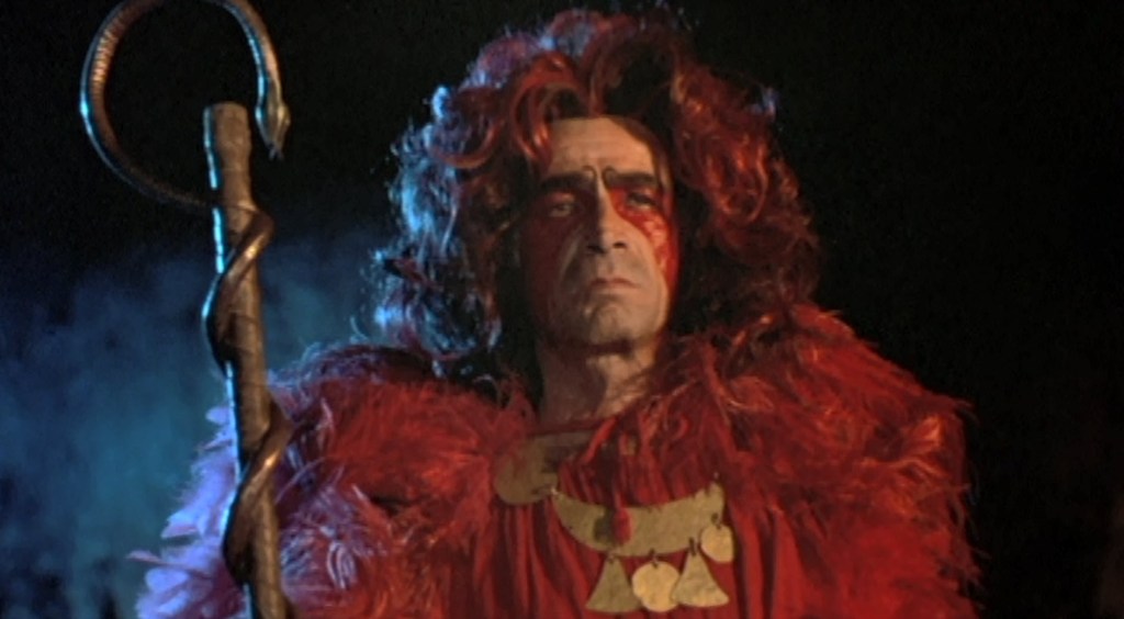 Now, here’s what I don’t understand – a lot of things about this movie. So, Urania is doing a LOT of the legwork in this movie. That is either because she has great legs or because it’s highly unlikely Lou Ferrigno will be incredibly believable when shown conversing with spirits and what have you. Some of the dialog that poor Urania has to say is incredible. The fire fairies? Those are constantly referred to as the “Little People”. Is Darby O’Gill with them too? Anyway, so she keeps saying she has to talk to the Little People. She converses with them in two different places, and then tries to go to another temple, but then has to say that she just needs to go talk to the Oracle of Death. What?!?
