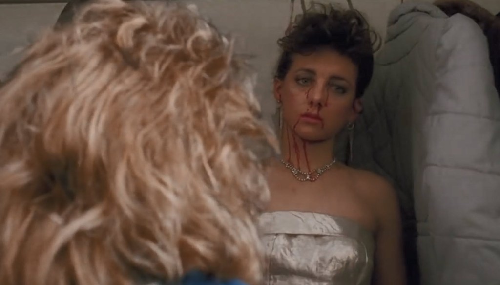I think someone who was making or writing this movie decided that there wasn’t quite enough murdering going on in their mad slasher flick. So they have this random person we never saw before, who hit on Roger, become a victim. The woman goes into a washroom or something to freshen up. The devil guy comes in and she tells the killer that she met this adorable, younger (this is key because I’m sure this woman is intended to be a little older than Roger) cop man that she wants to take home. She asks the devil killer man to tighten her corset under her gown. I’m not sure why she would wear a corset under a gown like that, but whatevs. She says that guys like them titties hard and firm. So the killer kills this lady by tightening her corset and then stabbing her.