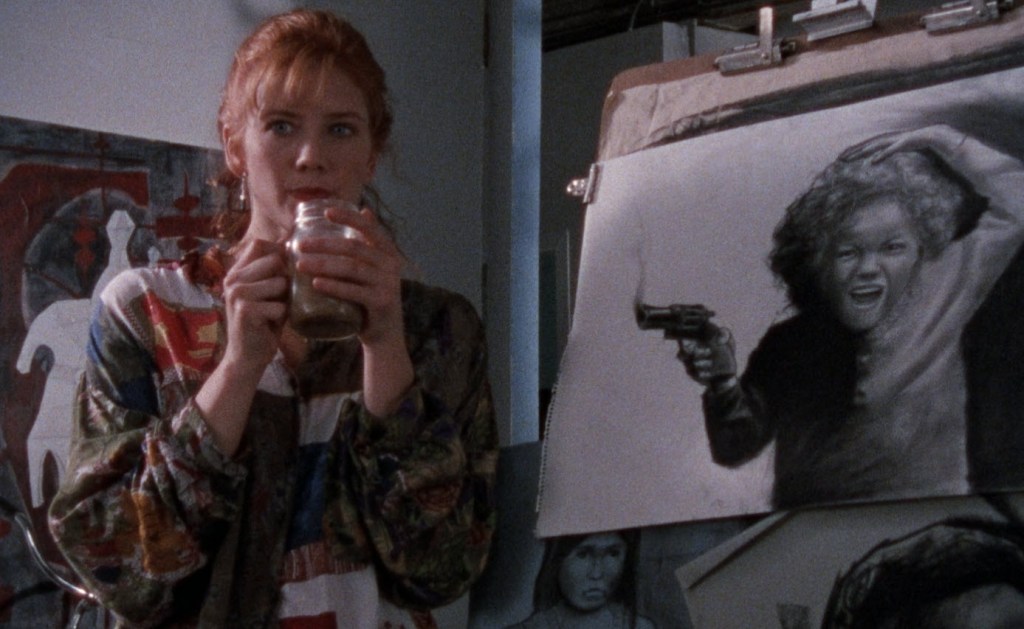 Again, these two characters are also very different styles of characters. As I mentioned previously, Naughton is cracking wise like he’s a transplant from a Lethal Weapon movie. I don’t think I’ve ever seen David Naughton in a movie in which he is playing it 100% straight. He’s always having to be snide or sarcastic, etc. Meanwhile, Haiduk’s Alison is a chain smoking, free spirit, artist type. She’s giving off sensual vibes. She’s wearing loose clothing that shows off shoulder or wearing leggings that stay tight to her legs and butt. She talks in very flowery language about the purpose of life, or her drive, or what she hopes to accomplish with her talent. She draws herself nude as if she’s a centerfold in Playboy.