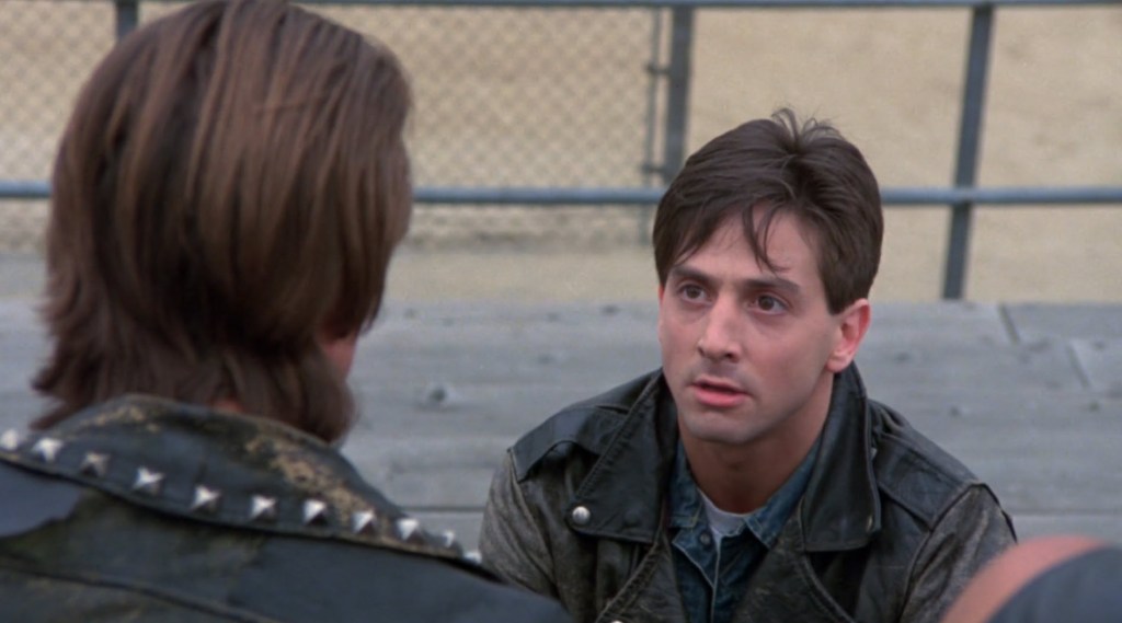 I like that this movie has the John Carpenter font for the credits. That is a damn solid piece of evidence you are watching an 80s movie that is likely gonna have a cult following. But anyway, the movie opens with a kid taking off for a night with his friends. He gets a little beef from his old man about it being a school night. As soon as his dad shuts the front door, he finds his gang gear he hides outside and gets picked up by his pals. These are the Scars. They drive around, drink beer, create some havoc, and so forth. All of this to the tune of a somewhat significant song from my youth – “Nothing’s Gonna Stand in Our Way”.