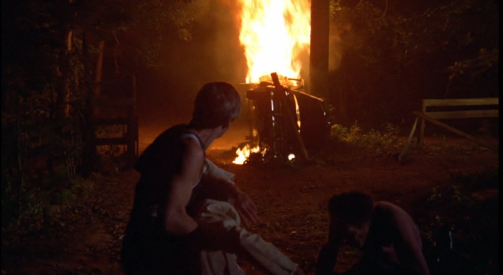 That night, a drunk driver swerves to miss a cow that has wandered onto the road and turns his car over. Kyle and Gumshoe save the man seconds before the car goes up in flames. I’m not sure, but I think it’s possible this movie is trying to tell us that Kyle is a good guy.