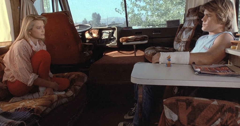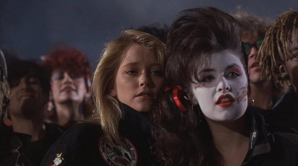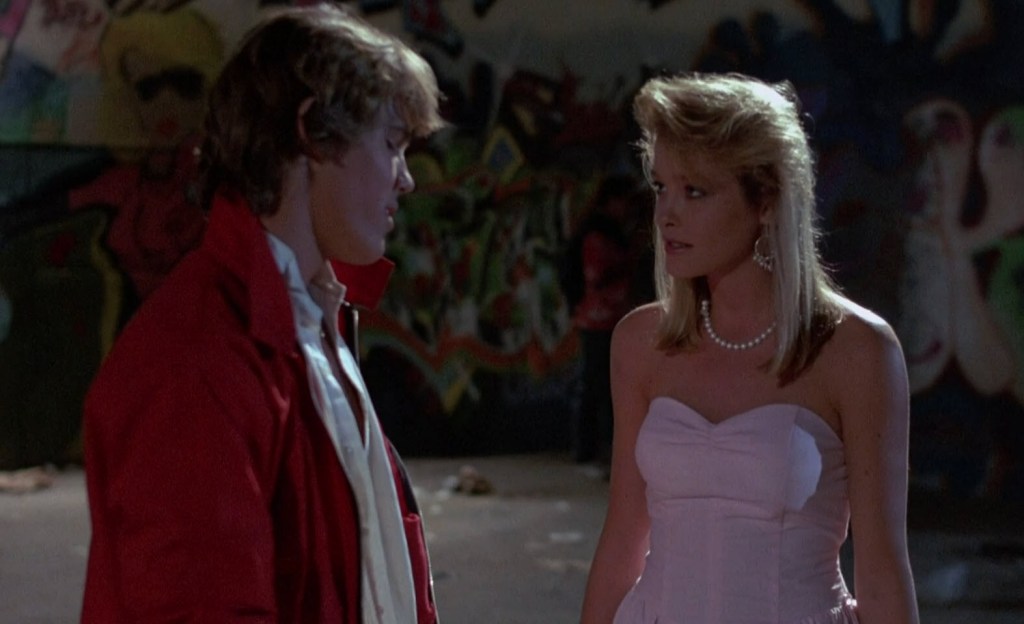 They end up spending the entire night together. It’s a cute scene, but because she doesn’t get back until morning, Tommy is quite pissed. He went to the club with his little sister. She disappeared. He tells her to get lost if she’s not going to let him look after her. But after she apologizes and flashes a smile, he smiles back. Again, Robert Rusler is just a fucking treasure. Find a goddamn movie he’s in that he is not incredibly engaging. But uh oh… She says she met Corey and that he’s from the Valley. He says she hangs with Daggers or she goes home.