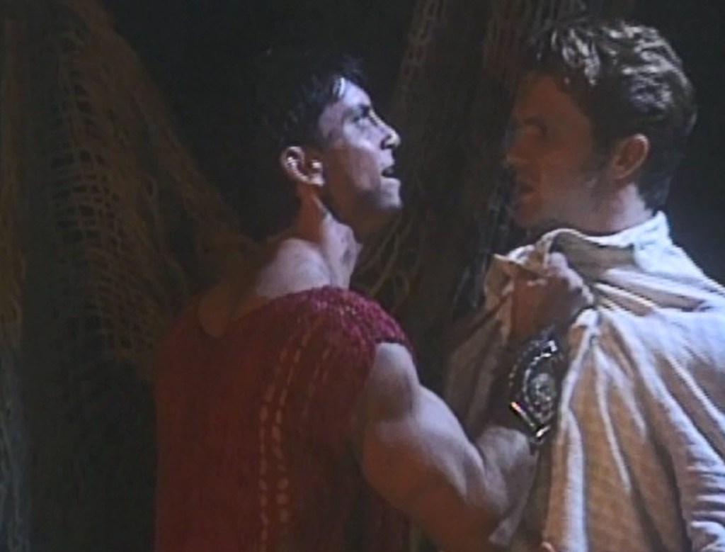 Anyway, that scene kind of ends and Blondie spots a guy in another cell across the way and decides to put on a little show for him. You know… because the two girls grinding against each other earlier wasn’t enough of a show – at least for this guy. When a guard walks by, the guy slinks back to the bunk in his cell, frustrating Blondie. Later, the guy finds Blondie somewhere in the showers or locker room or the engine room… I’m not sure. She’s wearing a towel as if she just got out of the shower and he’s fully clothed as if he’s working on the engines. Anyway, he tells her she needs to shape up or she’s going to find herself detained here for the rest of her life. They aren’t supposed to look at or talk to each other. She says she’s going to leave and she’s not going to listen to anything anyone else has to say.
