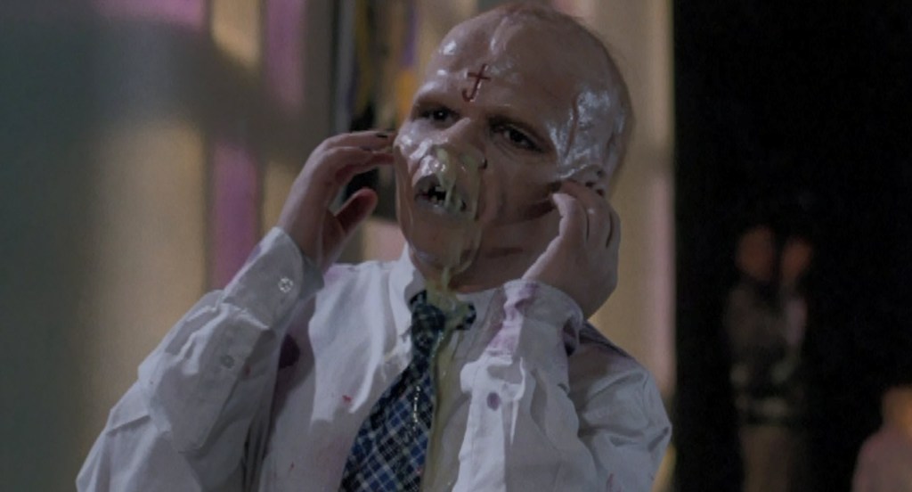 Another student that hasn’t arrived at the school yet is Tracy. She’s stuck on the side of the road with a flat tire with her younger sister and father. She’s a real dick to him, but he’s kind of a dick back to her. As she impatiently awaits him finishing putting the spare tire on the car, a radio report talks about a bizarre incident involving a church bus and the people on it. That church bus, I might add, is barreling down the road and stops right behind the car. Tracy sees her dad’s body pulled under the bus. Tracy is then attacked by a nun who had been driving that bus and is attacked by a peculiar looking guy with stripes on his face from the backseat. Tracy’s sister escapes but it looks like it’s curtains for Tracy.
