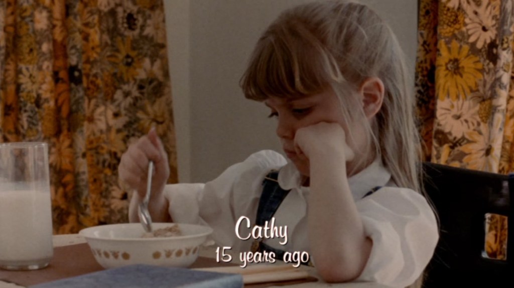 The movie starts off with some peculiar harpsichord music that feels like it comes from a British horror film of the 60s and 70s. The credits are written in script. It just has this odd vibe to it as it begins to zero in on an urban neighborhood where kids play jump rope outside, moms do the ironing in a tiny ass kitchen while cooking breakfast and bitching out their daughters for not eating their food. Anyway, we see our leading lady, Cathy, from 15 years ago. She seems to be poking around her shredded wheat cereal in bowls I am positive we had when I was a kid too.