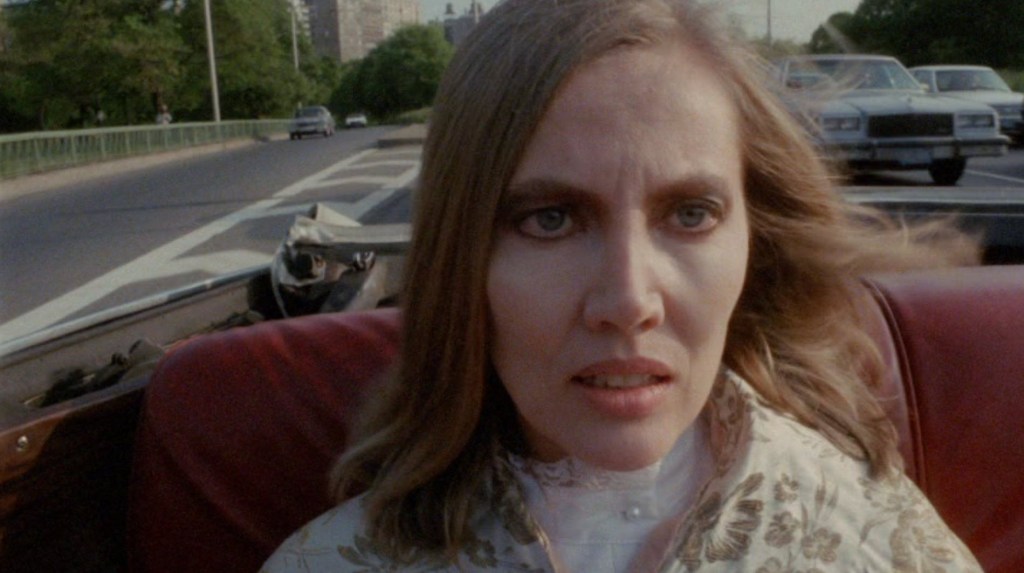 Jump forward to the present. Cathy’s all grown up and walking around the city with what I assume is a cello. She’s followed by the same woman in the street from when she was a kid. She very nearly walks out into the street and gets hit by a taxi as she crosses to see her fiancé, Bob. In the back of that taxi is the little girl in the white dress that was around when she was nearly strangled by the jump rope.