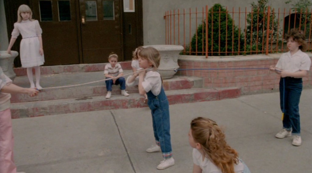 Cathy does get outside to watch some of the other girls playing jump rope. The other kids are nice to her and let her get in on this game. Well, that’s until the jump rope wraps around Cathy’s neck and the kids all begin to stare at her. In fact, there’s also a mysterious woman standing in the street watching this play out.