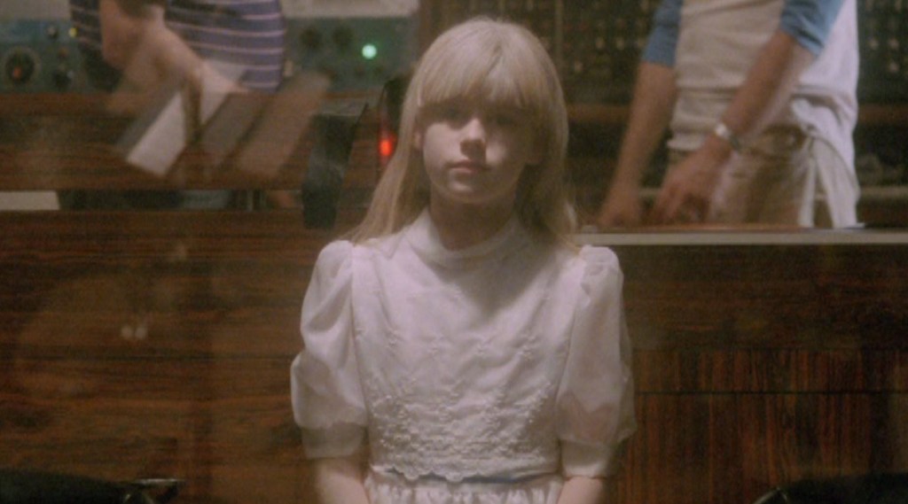 While cutting a classical music album with other musicians, Cathy spots the little girl in the white dress staring back at her through the window to the producer’s control room. She shouts and reacts to it, but the other other musicians don’t see her. The producer and his assistant were arguing over several things so they didn’t even notice how she reacted or that it made the other musicians stop playing.