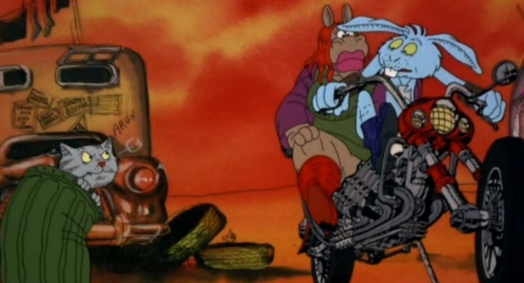 We meet two new characters after Fritz and Winston get back out on the road. First, there’s Blue, a heroin-addicted rabbit. He rides his motorcycle all over the place, and he’s got swastikas all over his bike and vest. Second, Blue’s girlfriend, a big-tittied hippo named Harriet. They’re out in the desert as Fritz and Winston come to a stop. Winston’s VW Bug is broken down. Fritz thinks it’s great that they are out in the desert. Winston’s pissed that he’s been asleep for two whole days. Fritz initially takes a look at the engine but can’t seem to figure anything out.