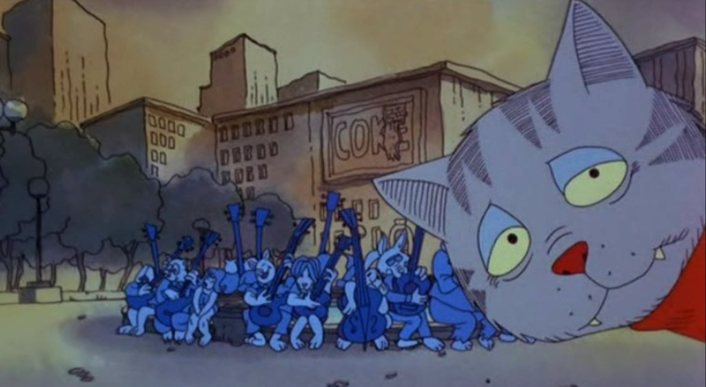 That should pretty much tell you what you have in store for you. Animal people, doing regular people things, and pissing off high rises onto the people below. If that’s not enough, we get the Fritz the Cat theme song as it then shifts from those fellas on the construction site. The very first line says, “Hey you fuckin’ intellectuals. You think you’re so where it’s at?” But don’t worry! Fritz the Cat is here to help you learn what life’s all about.