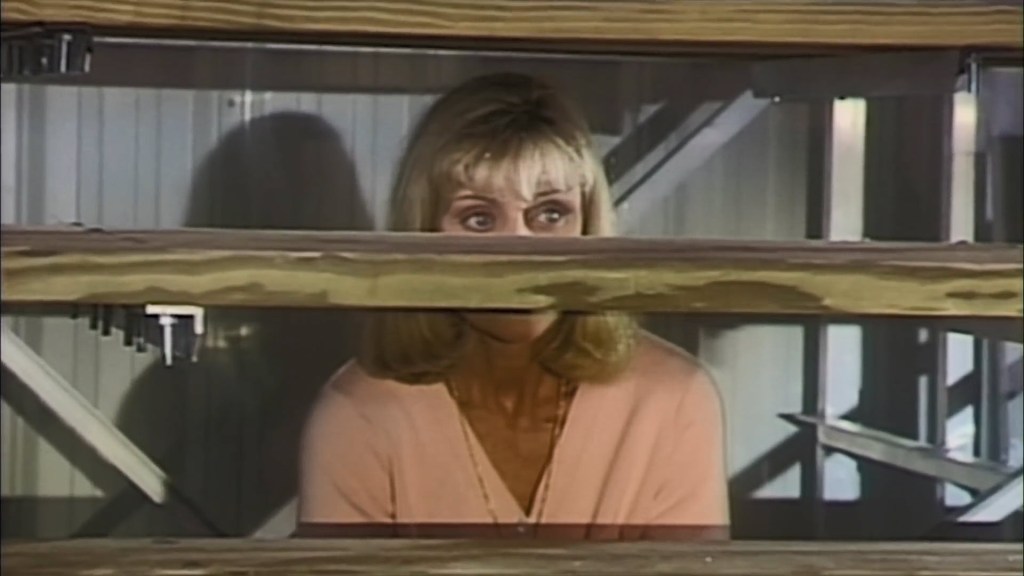 After the show’s taping, Jerry, the producer (clever to tie it that close to Jerry Springer, I guess), is wrapping up the day. Paula Sands confronts him and tells him he’s a garbage person for being untrustworthy for guests to appear under false pretenses. A person wearing something similar to what Mommy would wear goes up into the catwalks above the stage and messes about with some equipment to hit Jerry on the head with. She then goes down to him and uses a high heel to kill him, again, framing Mommy.