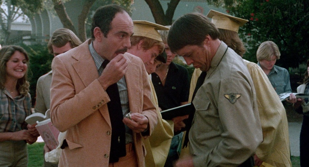 The rest of the school, of the people who haven’t died yet, are gearing up for the big graduation day festivities, but before we can get to the big day, we gotta have a rockin’ party. In back to back scenes, we have some students jamming out and then a big party goes down with a full on rock band and a roller rink and everything. I feel like I was born a little too late. We didn’t roller skate around in circles at a big graduation party as a class. We were lucky to all get along across socio-economic lines.