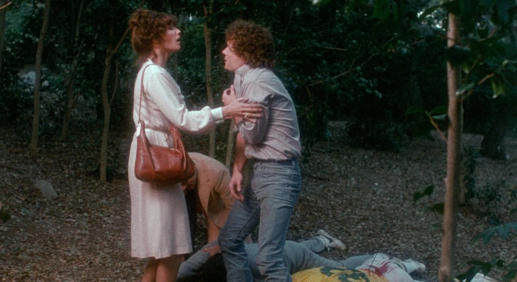 Anyway, I kind of feel like we have to be getting pretty close to some big deaths and a reveal of who’s the killer. Clearly, our suspect list is meant to have Anne and Coach Michaels at the top. However, Michael Pataki with his drawer full of knives is probably the next best suspect. The fourth suspect is emerging with that goofball cop being a bit of a weirdo. He has issued a warning that he could make Coach Michaels’ life hell and hurt him real bad if he gives him reason to. He also has begun snooping around and has followed Linnea Quigley and her boyfriend, Tony, when they ditch the party to go fuck in the park.