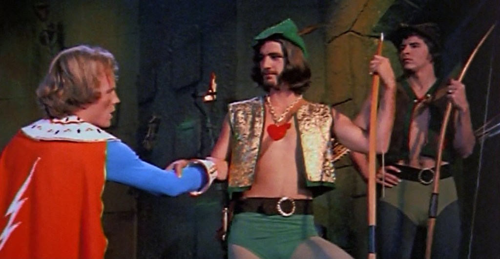 So, again, over the last, I dunno, ten minutes, Flesh and Flexi returned to save Dale, only for Dale to be kidnapped, and I think Wang was ultimately defeated, but then Dale is nearly initiated into a band of Amazons by some sort of lesbian ceremony, and now Flesh is fighting a Harryhausen stop motion bug monster. The bug creature is defeated by an arrow shot at it by Robin Hood.