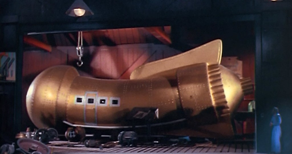 There’s just one problem, though, one of the forest people is a turncoat and is actually working for Wang. After Jerkoff created a device that will destroy the ray, and showed it off, the turncoat warned Wang and sabotage their attack on the sex ray. What’s more, the traitor made off with the magic pasties. Now, what we see is the forest people ship being pulled into a toothy chomp compactor that destroys the ship. After a clever break as if it is a serial and a brief intermission (this movie has an intermission after the second act by the way), our heroes actually escaped before the ship was destroyed when they used umbrellas to float down to the ground. It’s… It’s a whole thing. Don’t… Don’t worry about it.