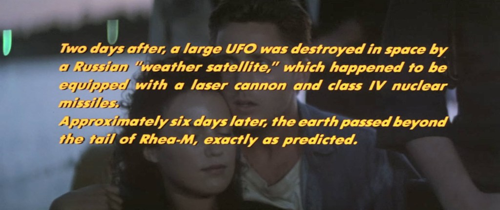 Then, to end it with just saying, “Oh yeah… By the way, it’s a UFO. They were using our machines to clear the way for them to come down and take over. Have fun with that surprise we dropped on ya!” But here’s the thing about that too… We were offered two explanations in two different ways. Brett was the one who mentioned the comet. Okay, a comet’s tail is kind of an interesting culprit. I can accept that. Bill had a scene where he wondered out loud if it could be an alien attack. I like that fine too. There’s something to play with there. So, we already have two competing theories. But the final caption card talks of the Russians blowing up a UFO AND a few days later Earth passed through the tail of the comet as predicted